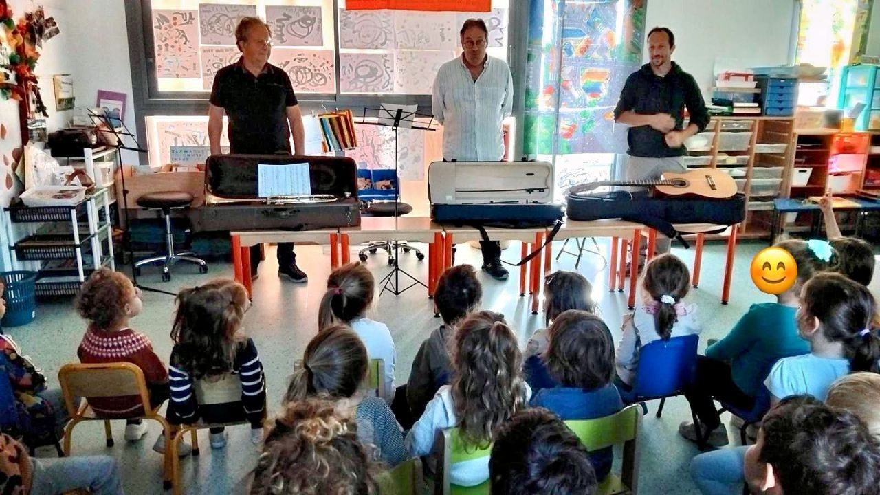 Mardi matin, notre école a eu le plaisir d’accueillir trois musiciens. Dès leur arrivée, ils ont éveillé notre curiosité avec un petit jeu de devinettes pour nous faire découvrir leurs instruments.