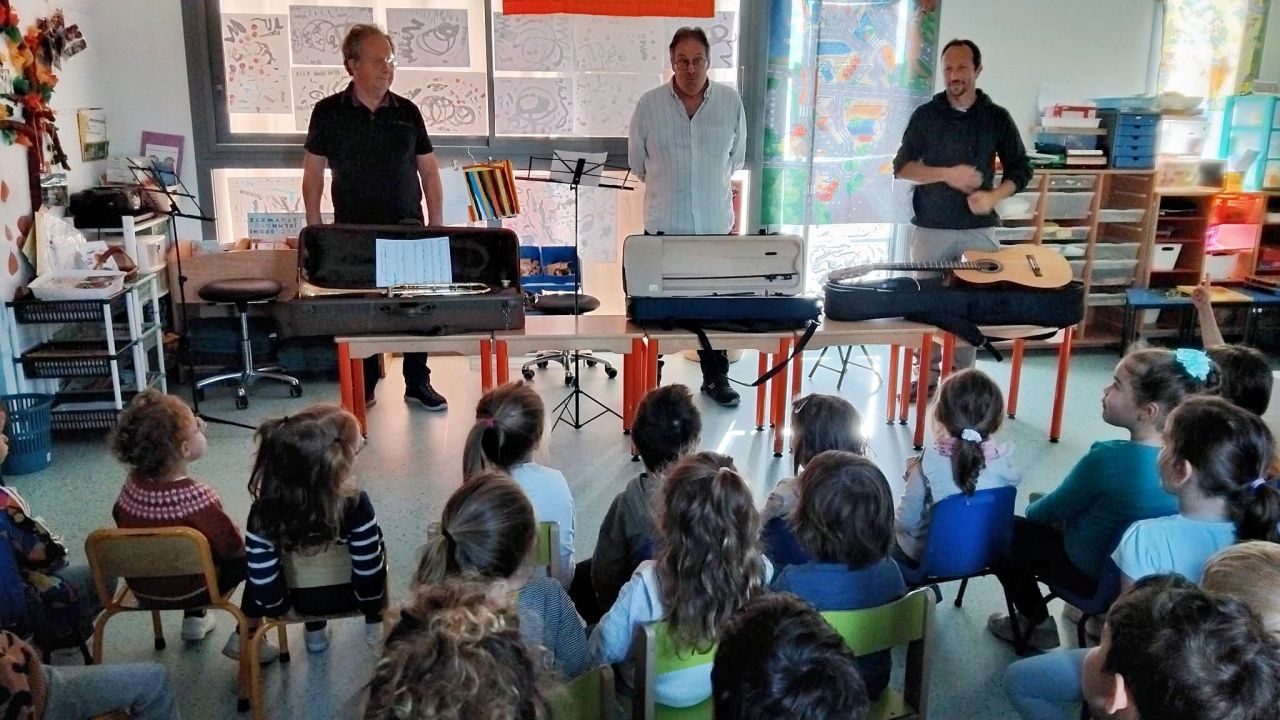 Mardi matin, notre école a eu le plaisir d’accueillir trois musiciens. Dès leur arrivée, ils ont éveillé notre curiosité avec un petit jeu de devinettes pour nous faire découvrir leurs instruments.